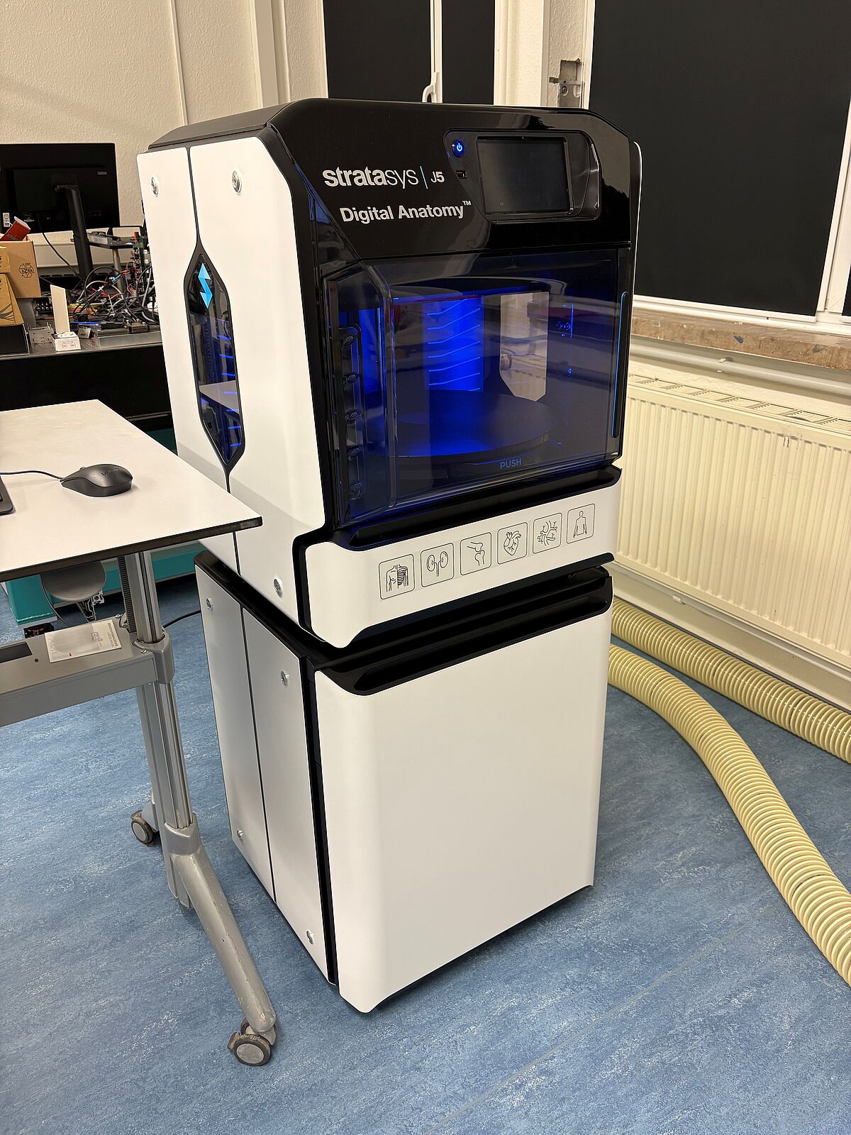 The new multi-material printer makes it possible to produce high-resolution, multi-color prints using a wide range of materials. In addition to transparent and solid materials, flexible materials are also available that can realistically replicate skin, soft tissue, or bone. This allows models to be created that closely resemble reality, not only visually but also haptically.